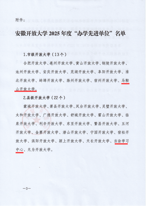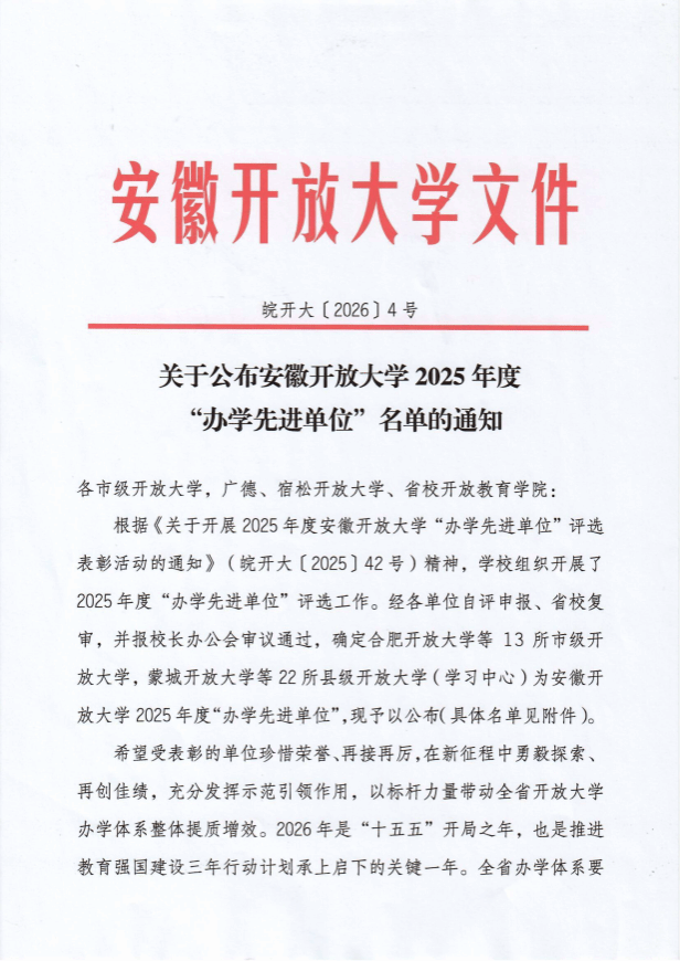 近日,安徽开放大学2025年度办学评价结果正式公布,马鞍山开放大学凭借扎实的办学基础和突出的业绩表现,成功获评“安徽开放大学2025年度办学先进单位”。这一荣誉不仅是对我校2025年度各项工作的高度认可,更是对全体教职工凝心聚力、开拓进取的最好褒奖。